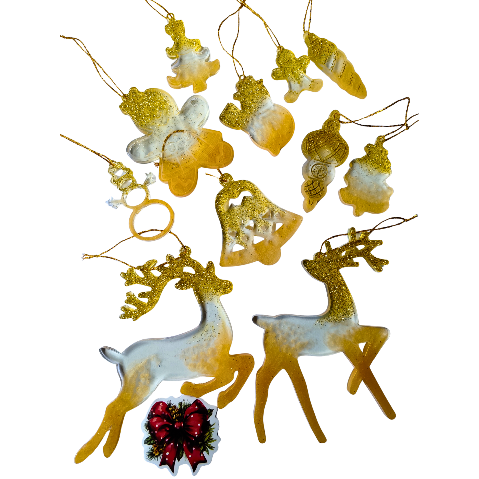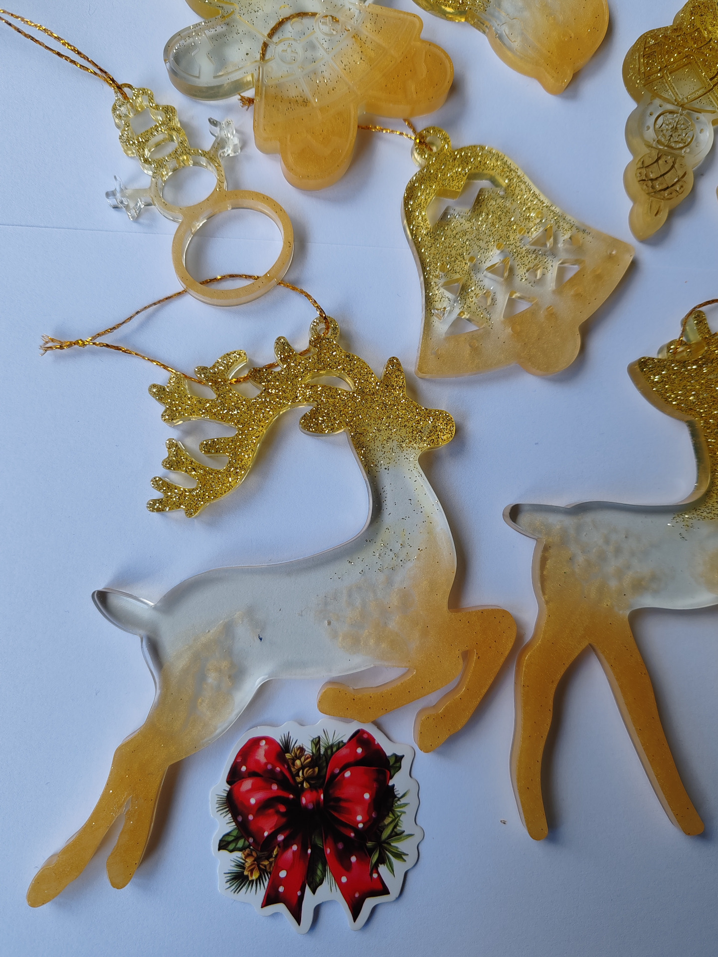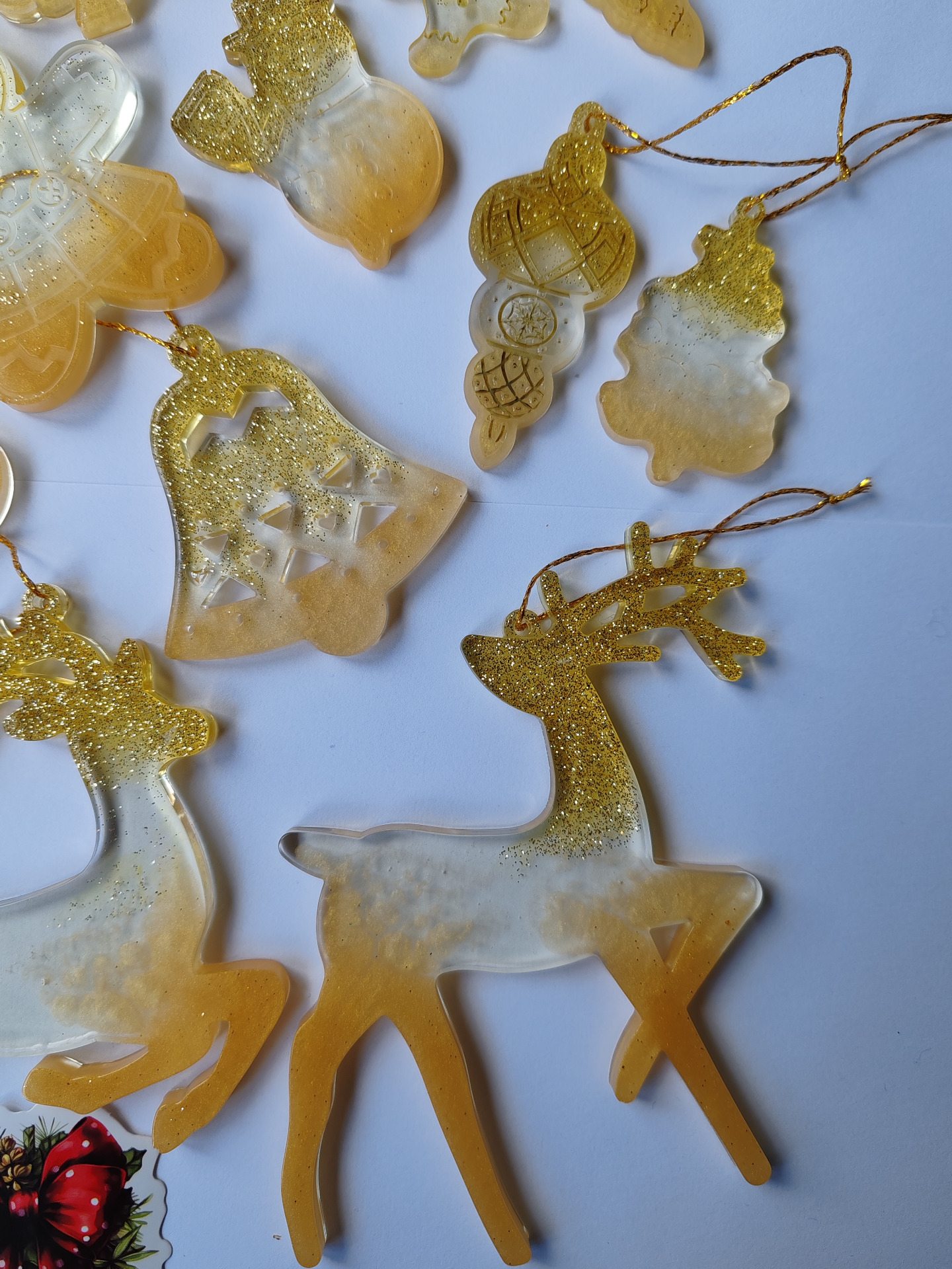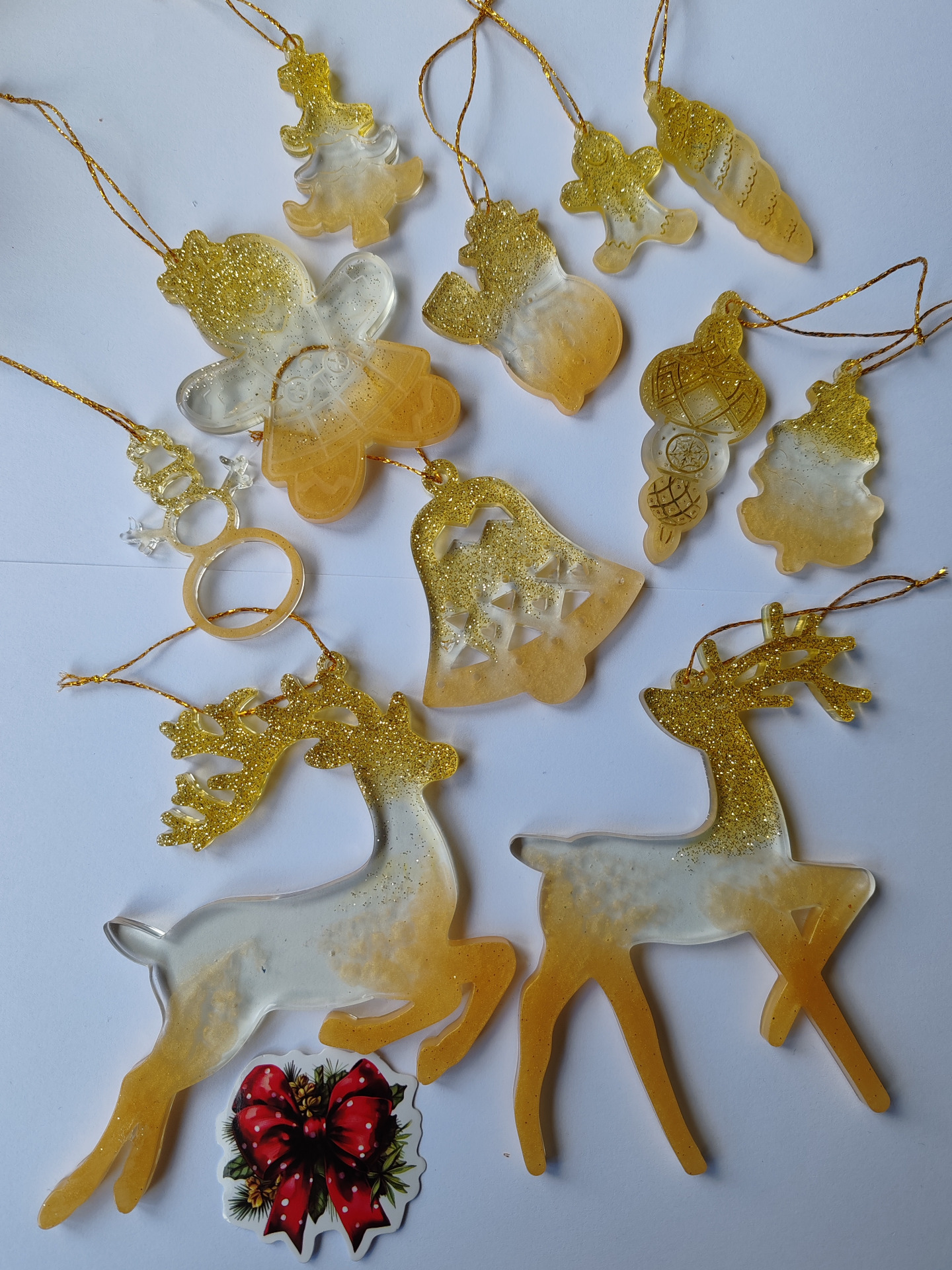 Krásná pryskyřicová sada ozdob na vánoční stroměček, ozdoby jsou krásné a třpytivé včetně provázku na zavěšení na stromeček. Každá sada je originál a nikdy není stejná. Rozjasněte svůj stromeček o originální ozdoby, nebo darujte sadu jako krásný dárek. Ozdoby jsou z pryskyřice ale jsou stále trochu ohebné a minimálně lepivé, zohledněno v ceně, dodělávány byly UV pryskyřicí, proto je jedna strana krásně lesklá. Může obsahovat nějaké bublinky či nedokonalosti. Tvořeno s láskou a pečlivostí.
